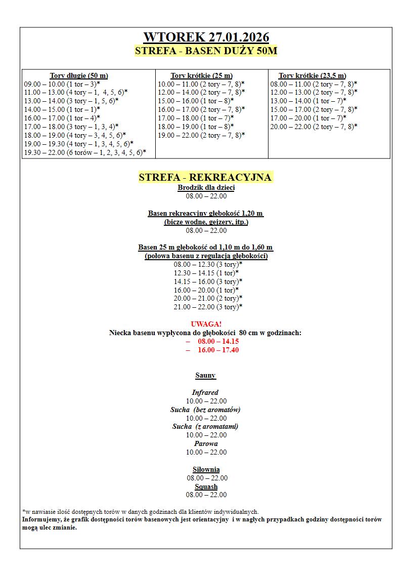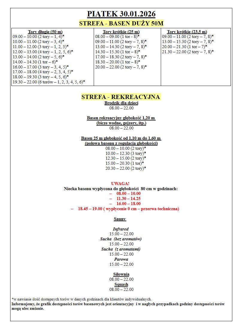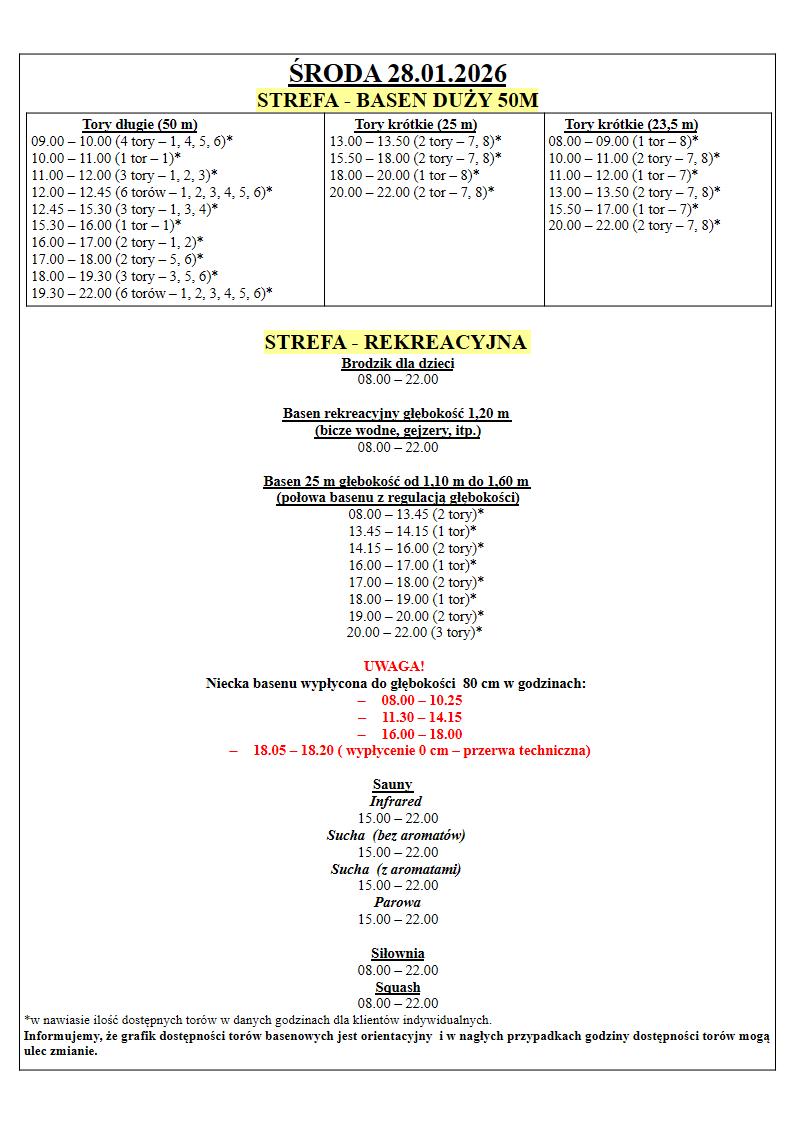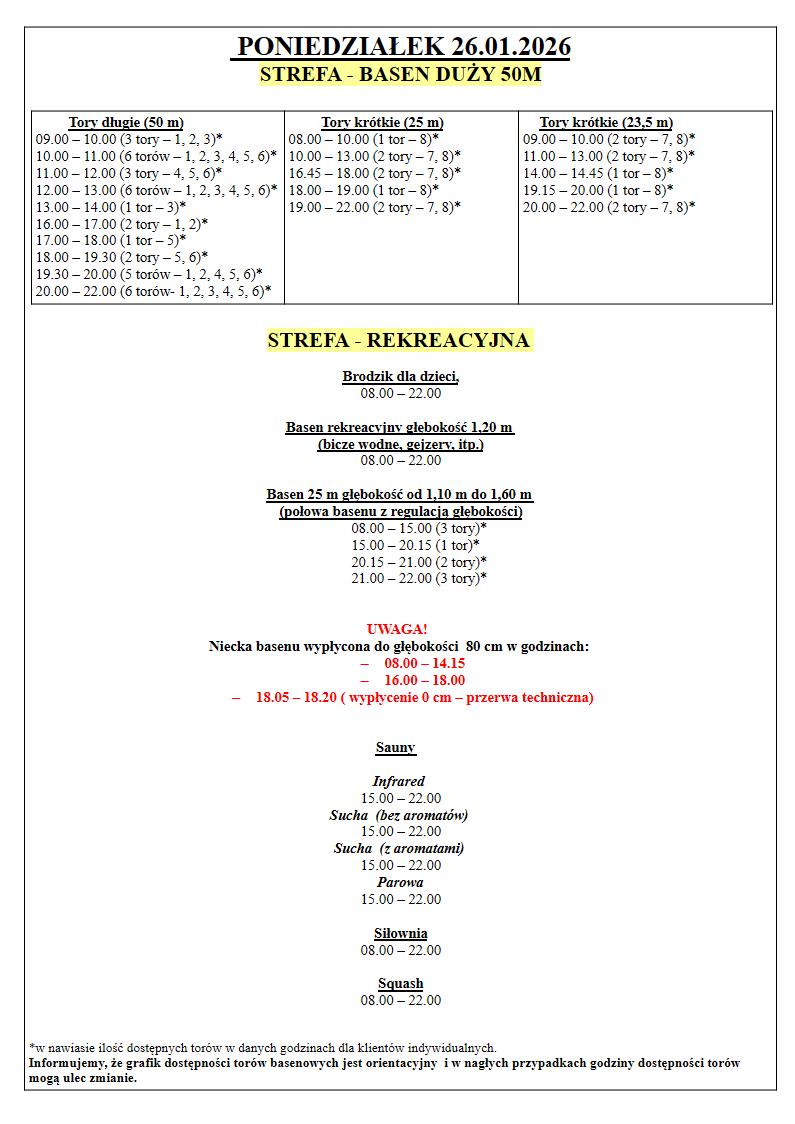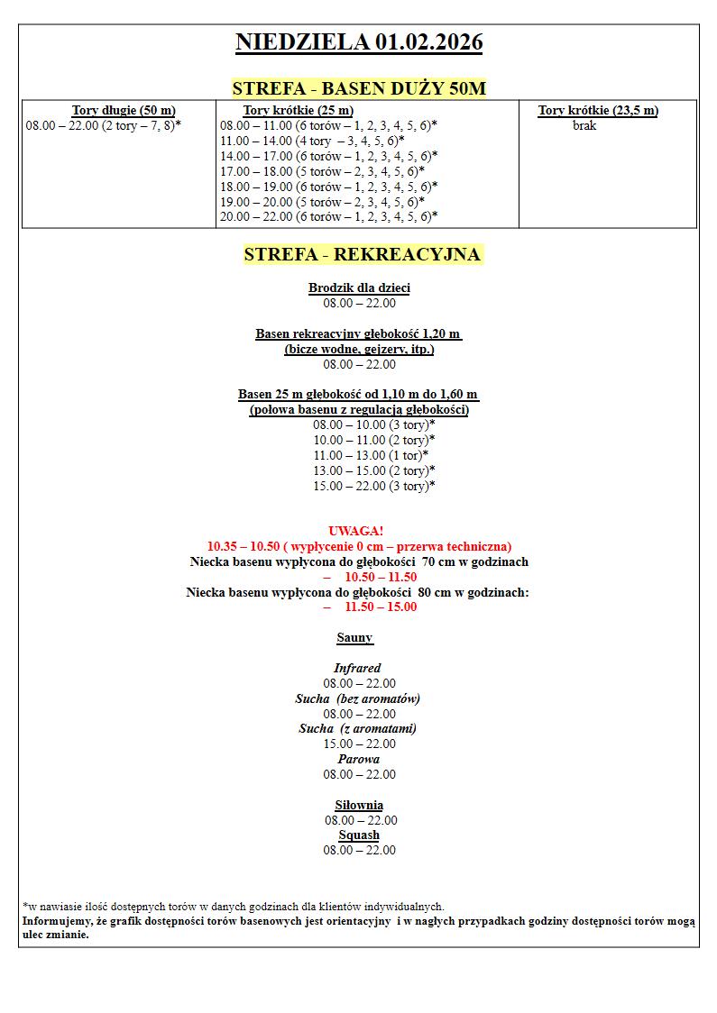 Grafik Dostępności torów w dniach 26.01.2026 – 01.02.2026