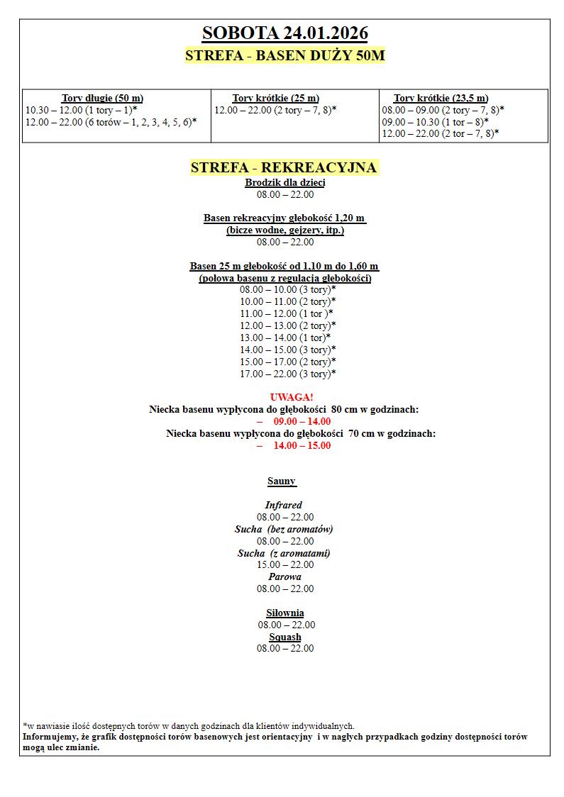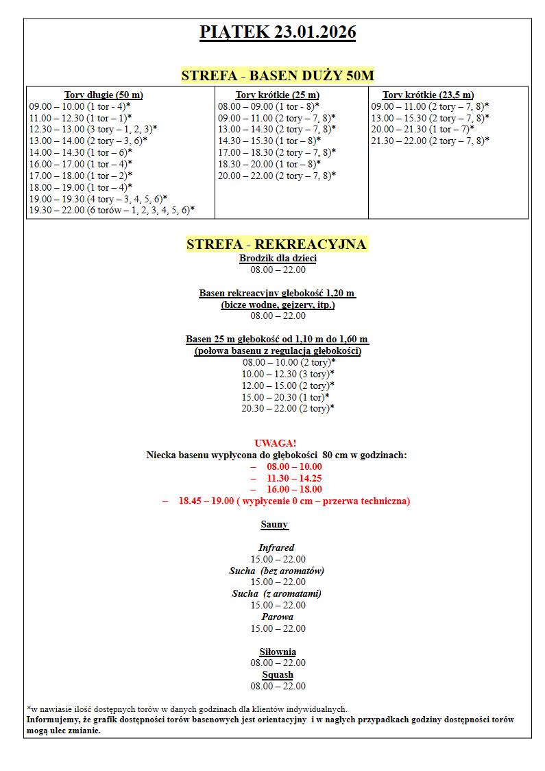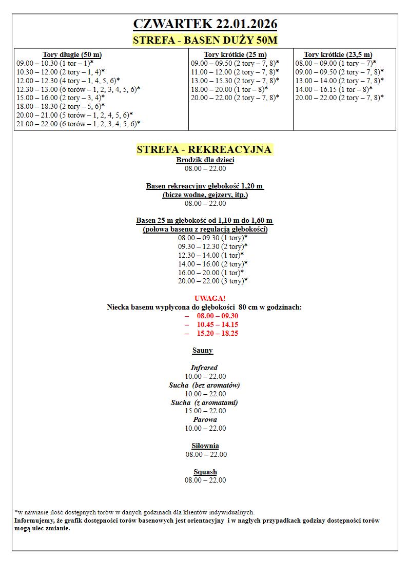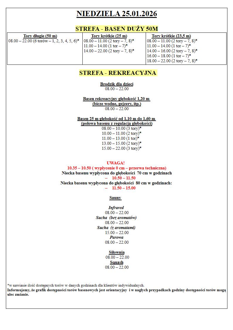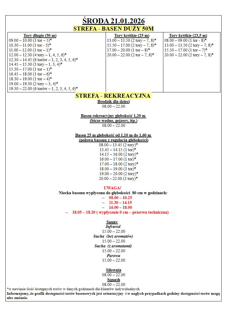 Grafik Dostępności torów w dniach 21.01.2026 – 25.01.2026