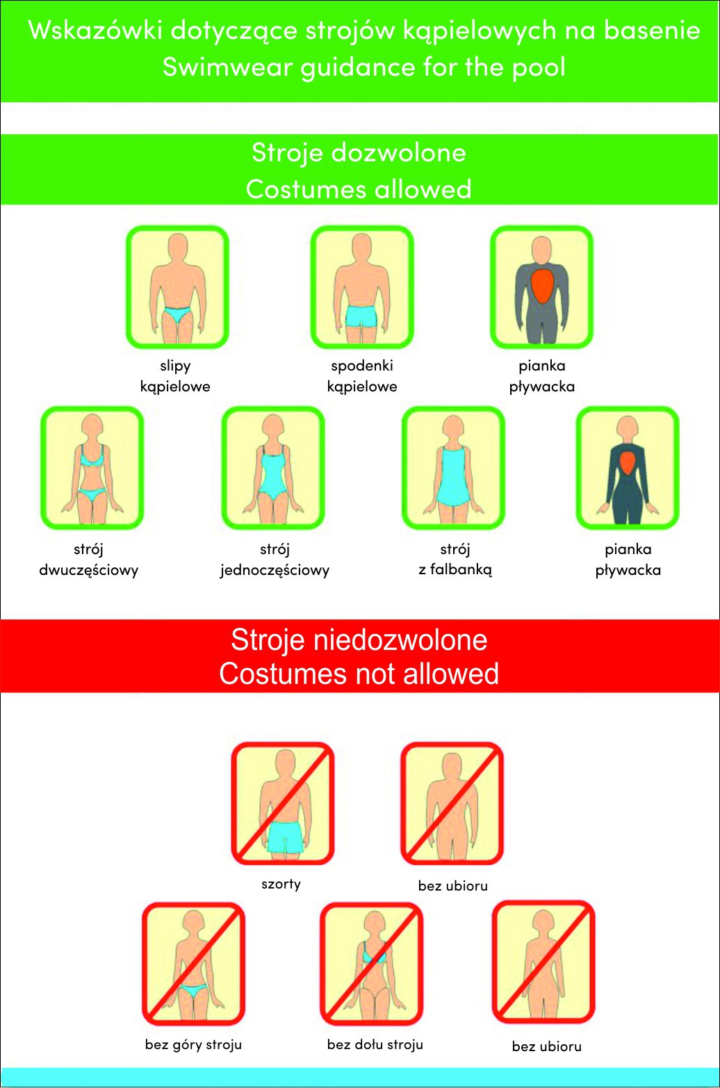 Informujemy, iż w trosce o higienę naszych klientów oraz o bezpieczeństwo kąpieli od strony sanitarnej obowiązują stroje takie jak zamieszczone na infografice obok.