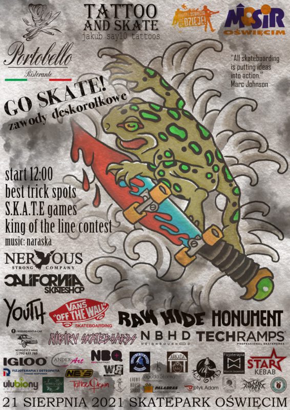 21 sierpnia 2021 zapraszamy na Skatepark przy ul. Szustera na zawody deskorolkowe GO SKATE! Zawody są organizowane przez Księgarnia by Jakub Say10 Tattoos we współpracy z Miejskim Ośrodkiem Sportu i Rekreacji w Oświęcimiu.